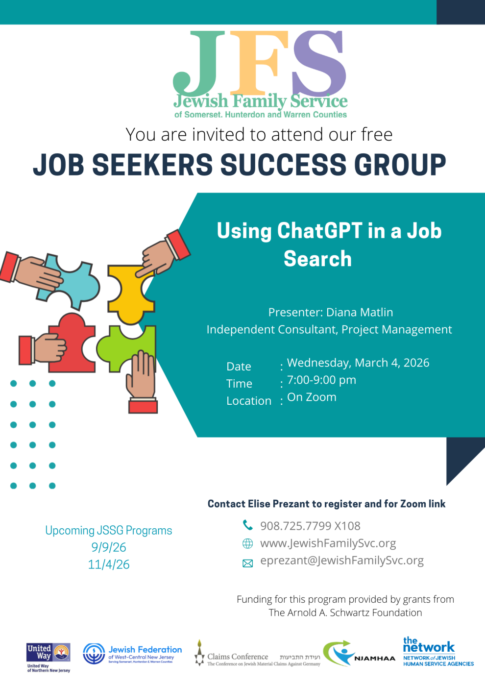 Jewish Family Service of Somerset, Hunterdon and Warren Counties is offering a Job Seekers Success Group for active job seekers who are unemployed, underemployed or seeking a career change. The next group will be held on Wednesday, March 4, 2026 from 7:00-9:00 p.m. via Zoom. The topic for this session is “Using Chat GPT in a Job Search" presented by Diana Matlin, Independent Consultant, Project Management.
