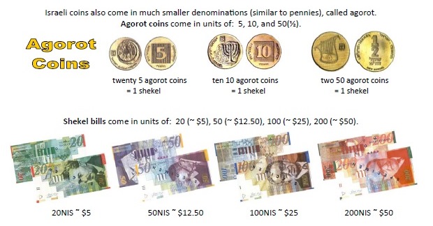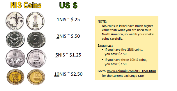 The local currency is the New Israeli Shekel. Each shekel is worth about 25 cents. Shekel coins come in units of 1 (~25 cents), 2 (~50 cents), 5 (~$1.25),and 10 (~$2.50), as well as much smaller coin denominations called agorot. Shekel bills come in units of 20 (~$5), 50 (~$12.50), 100 (~$25) and 200 (~$50) denominations. One important thing to keep in mind is that coins in Israel have much higher values than what we are used to in North America, so watch your coins carefully. Go to www.coinmill.com/ILS_USD.html for the current exchange rate.
